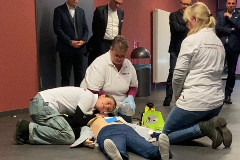 Bei einer moderierten Live-Präsentation der Anwendung wurden drei registrierte Ersthelfende über die App alarmiert, um die im Realfall zugeteilten Rollen zu demonstrieren: Helfer eins und zwei führen die Wiederbelebung durch, Helfer drei bringt den nächstgelegenen AED (Automatischen Externen Defibrillator) zum Einsatzort. Auch der Rettungswagen des OV Marxheim war im Einsatz, um die Demonstration zu einem realitätsgetreuen Abschluss zu bringen. Die Ersthelfenden wurden vor Ort mit einer Lebensretter-Tasche für zukünftige Einsätze ausgestattet.