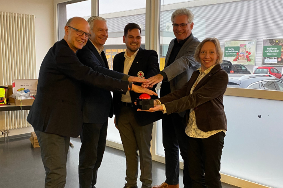 Im Bild von links nach rechts: Herr Dr. Frank Stieler (DRK), Herr Michael Cyriax (Landrat MTK), Herr Daniel Elschenbroich (DRK), Herr Jörg Blau (Ärztlicher Leiter Rettungsdienst MTK), Frau Sabine Mushake (DRK)